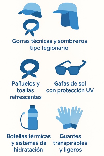 👉Incluye todos aquellos complementos que puedan ayudar a enfrentarse a las altas temperaturas como por ejemplo guantes transpirables y ligeros, calcetines técnicos anti-calor o brazaletes o manguitos refrigerantes.